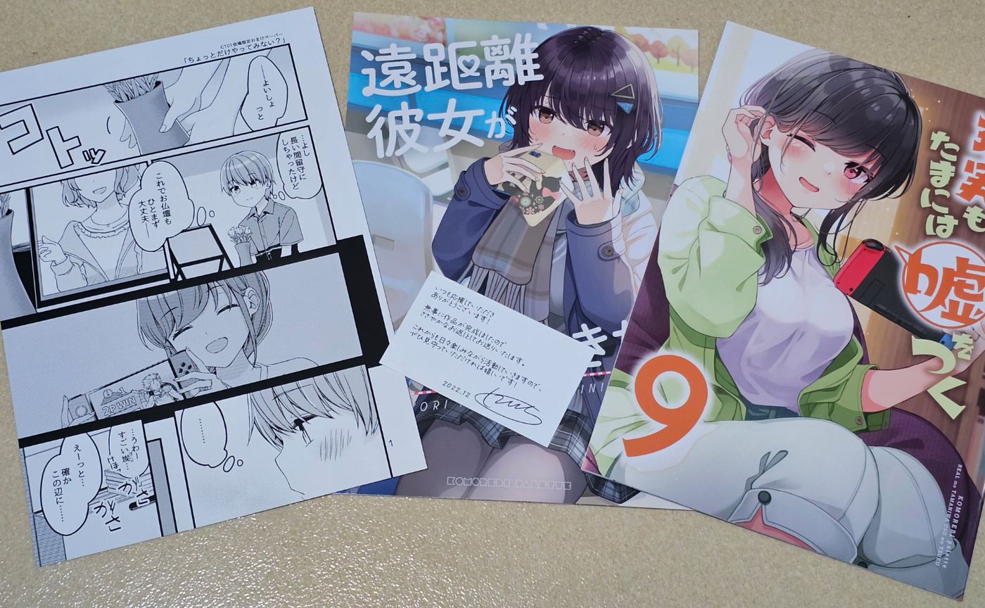 작가님 사인이 적힌 클리어 파일과 현실구라 9권, 원거리여친, 코미케 한정책입니다